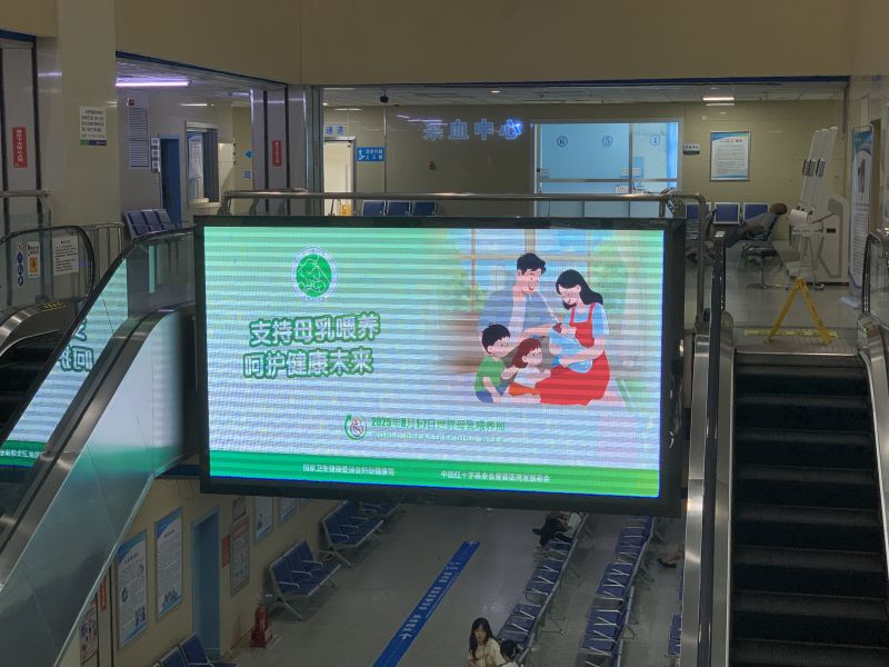 在门诊大厅设置宣传台,张贴母乳喂养宣传主题海报,医护人员为过往人群发放宣传科普手册。